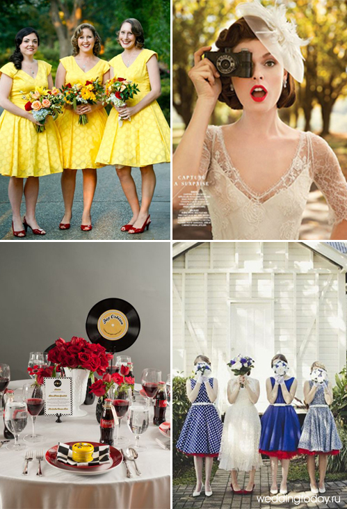 Жених должен так же соответствовать стилю. Если у невесты красные ленты, то он может надеть красный галстук. Все элементы костюма должны быть подобраны с особой тщательностью. Важный элемент гардероба – туфли. Изюминкой той эпохи была лакированная, остроносая обувь. Если волосы у жениха длинные, то можно и прическу сделать как у певца Элвиса Пресли, конечно, это не обязательный элемент.