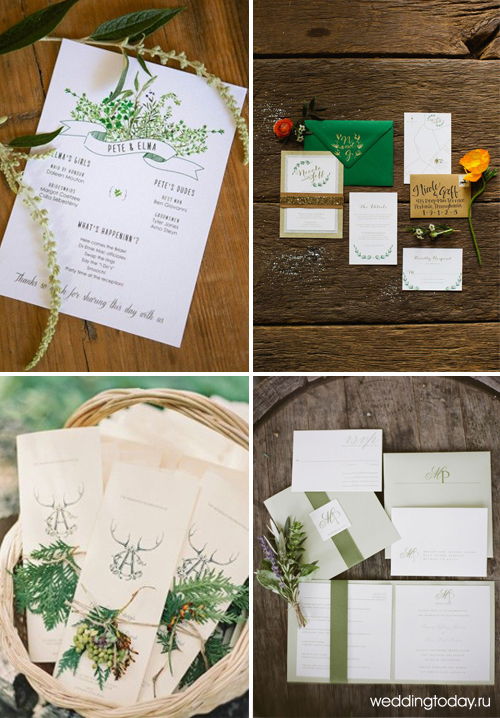 Для классического варианта пригласительных, выбирайте оригинальные атласные ленточки или цветочные композиции. Только не берите сплошной зеленый цвет. В моно варианте его будет много, лучше разбавить белым или желтым цветом.