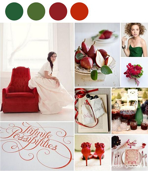 Сочетание в красно-зеленом цвете подойдет для свадьбы в зимний период. Свадьба пройдет как очень яркое и модное мероприятие. Начнем с пригласительных. Зелено-алая гамма создаст у гостей позитивное настроение. Невеста на такую свадьбу надеть может на выбор красное или зеленое платье. Особенно эффектно смотрится красный цвет на фоне ослепительно белого снега. Жених должен включить в костюм элементы этих цветов.