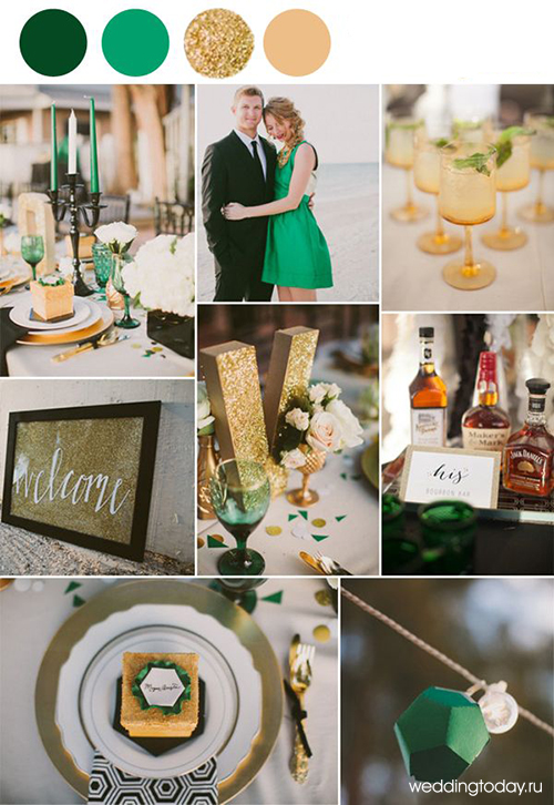 Более благородным, но не менее ярким вариантом станет цветовое сочетание с золотым. Свадьба в зелено-золотом цвете подойдет для тех, кто любит стиль и роскошь.